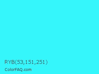 RYB 53,151,251 Color is a normal cyan color and the nearest color is Loeen #15f2fd. Hex code #35f7fb and RGB value is rgb(53,247,251). In RGB color space, this color is composed of 21% red, 97% green, 98% blue, In CMYK color space, this color is composed of 79% cyan, 2% magenta, 0% yellow , 2% black , In HSL color space, this color has a hue angle of 181° , 96% saturation and 60% lightness.