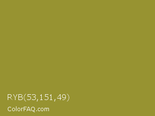 RYB 53,151,49 Color is a normal yellow color and the nearest color is Sycamore #908d39. Hex code #979331 and RGB value is rgb(151,147,49). In RGB color space, this color is composed of 59% red, 58% green, 19% blue, In CMYK color space, this color is composed of 0% cyan, 3% magenta, 68% yellow , 41% black , In HSL color space, this color has a hue angle of 58° , 51% saturation and 39% lightness.