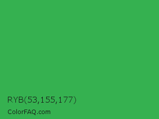 RYB 53,155,177 Color is a normal green color and the nearest color is Chateau Green #40a860. Hex code #35b150 and RGB value is rgb(53,177,80). In RGB color space, this color is composed of 21% red, 69% green, 31% blue, In CMYK color space, this color is composed of 70% cyan, 0% magenta, 55% yellow , 31% black , In HSL color space, this color has a hue angle of 133° , 54% saturation and 45% lightness.