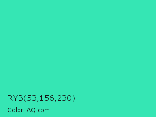 RYB 53,156,230 Color is a normal green color and the nearest color is Eucalyptus #44d7a8. Hex code #35e6b4 and RGB value is rgb(53,230,180). In RGB color space, this color is composed of 21% red, 90% green, 71% blue, In CMYK color space, this color is composed of 77% cyan, 0% magenta, 22% yellow , 10% black , In HSL color space, this color has a hue angle of 163° , 78% saturation and 55% lightness.