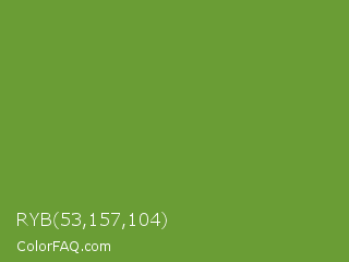 RYB 53,157,104 Color is a normal green color and the nearest color is Palm Leaf #6f9940. Hex code #6a9d35 and RGB value is rgb(106,157,53). In RGB color space, this color is composed of 42% red, 62% green, 21% blue, In CMYK color space, this color is composed of 32% cyan, 0% magenta, 66% yellow , 38% black , In HSL color space, this color has a hue angle of 89° , 50% saturation and 41% lightness.