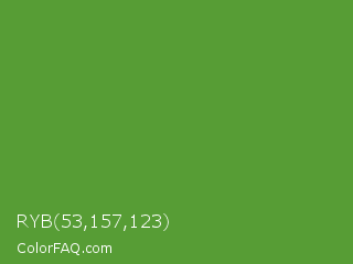 RYB 53,157,123 Color is a normal green color and the nearest color is Apple #4fa83d. Hex code #579d35 and RGB value is rgb(87,157,53). In RGB color space, this color is composed of 34% red, 62% green, 21% blue, In CMYK color space, this color is composed of 45% cyan, 0% magenta, 66% yellow , 38% black , In HSL color space, this color has a hue angle of 100° , 50% saturation and 41% lightness.