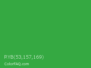 RYB 53,157,169 Color is a normal green color and the nearest color is Wageningen Green #34b233. Hex code #35a942 and RGB value is rgb(53,169,66). In RGB color space, this color is composed of 21% red, 66% green, 26% blue, In CMYK color space, this color is composed of 69% cyan, 0% magenta, 61% yellow , 34% black , In HSL color space, this color has a hue angle of 127° , 52% saturation and 44% lightness.