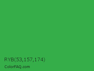 RYB 53,157,174 Color is a normal green color and the nearest color is Wageningen Green #34b233. Hex code #35ae49 and RGB value is rgb(53,174,73). In RGB color space, this color is composed of 21% red, 68% green, 29% blue, In CMYK color space, this color is composed of 70% cyan, 0% magenta, 58% yellow , 32% black , In HSL color space, this color has a hue angle of 130° , 53% saturation and 45% lightness.
