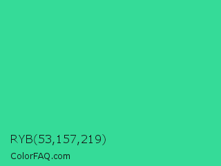 RYB 53,157,219 Color is a normal green color and the nearest color is Shamrock #33cc99. Hex code #35db98 and RGB value is rgb(53,219,152). In RGB color space, this color is composed of 21% red, 86% green, 60% blue, In CMYK color space, this color is composed of 76% cyan, 0% magenta, 31% yellow , 14% black , In HSL color space, this color has a hue angle of 156° , 70% saturation and 53% lightness.