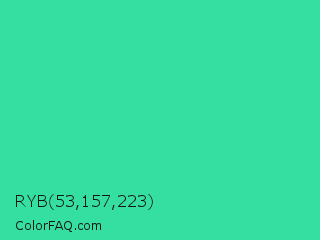 RYB 53,157,223 Color is a normal green color and the nearest color is Eucalyptus #44d7a8. Hex code #35dfa1 and RGB value is rgb(53,223,161). In RGB color space, this color is composed of 21% red, 87% green, 63% blue, In CMYK color space, this color is composed of 76% cyan, 0% magenta, 28% yellow , 13% black , In HSL color space, this color has a hue angle of 158° , 73% saturation and 54% lightness.