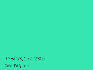 RYB 53,157,230 Color is a normal green color and the nearest color is Eucalyptus #44d7a8. Hex code #35e6b1 and RGB value is rgb(53,230,177). In RGB color space, this color is composed of 21% red, 90% green, 69% blue, In CMYK color space, this color is composed of 77% cyan, 0% magenta, 23% yellow , 10% black , In HSL color space, this color has a hue angle of 162° , 78% saturation and 55% lightness.