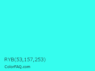 RYB 53,157,253 Color is a normal cyan color and the nearest color is Loeen #15f2fd. Hex code #35fdee and RGB value is rgb(53,253,238). In RGB color space, this color is composed of 21% red, 99% green, 93% blue, In CMYK color space, this color is composed of 79% cyan, 0% magenta, 6% yellow , 1% black , In HSL color space, this color has a hue angle of 176° , 98% saturation and 60% lightness.