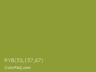 RYB 53,157,67 Color is a normal yellow color and the nearest color is Sycamore #908d39. Hex code #8f9d35 and RGB value is rgb(143,157,53). In RGB color space, this color is composed of 56% red, 62% green, 21% blue, In CMYK color space, this color is composed of 9% cyan, 0% magenta, 66% yellow , 38% black , In HSL color space, this color has a hue angle of 68° , 50% saturation and 41% lightness.