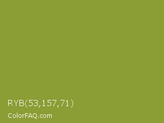 RYB 53,157,71 Color is a normal yellow color and the nearest color is Sushi #87ab39. Hex code #8b9d35 and RGB value is rgb(139,157,53). In RGB color space, this color is composed of 55% red, 62% green, 21% blue, In CMYK color space, this color is composed of 11% cyan, 0% magenta, 66% yellow , 38% black , In HSL color space, this color has a hue angle of 70° , 50% saturation and 41% lightness.