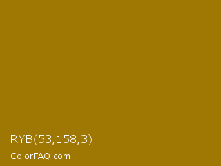 RYB 53,158,3 Color is a normal orange color and the nearest color is Buttered Rum #a1750d. Hex code #9e7803 and RGB value is rgb(158,120,3). In RGB color space, this color is composed of 62% red, 47% green, 1% blue, In CMYK color space, this color is composed of 0% cyan, 24% magenta, 98% yellow , 38% black , In HSL color space, this color has a hue angle of 45° , 96% saturation and 32% lightness.