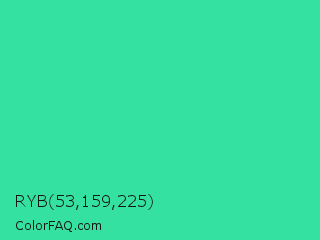 RYB 53,159,225 Color is a normal green color and the nearest color is Eucalyptus #44d7a8. Hex code #35e1a0 and RGB value is rgb(53,225,160). In RGB color space, this color is composed of 21% red, 88% green, 63% blue, In CMYK color space, this color is composed of 76% cyan, 0% magenta, 29% yellow , 12% black , In HSL color space, this color has a hue angle of 157° , 74% saturation and 55% lightness.