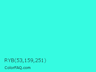 RYB 53,159,251 Color is a normal cyan color and the nearest color is Turquoise #40e0d0. Hex code #35fbe1 and RGB value is rgb(53,251,225). In RGB color space, this color is composed of 21% red, 98% green, 88% blue, In CMYK color space, this color is composed of 79% cyan, 0% magenta, 10% yellow , 2% black , In HSL color space, this color has a hue angle of 172° , 96% saturation and 60% lightness.