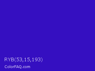 RYB 53,15,193 Color is a normal indigo color and the nearest color is Interdimensional Blue #360ccc. Hex code #350fc1 and RGB value is rgb(53,15,193). In RGB color space, this color is composed of 21% red, 6% green, 76% blue, In CMYK color space, this color is composed of 73% cyan, 92% magenta, 0% yellow , 24% black , In HSL color space, this color has a hue angle of 253° , 86% saturation and 41% lightness.