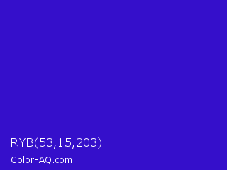 RYB 53,15,203 Color is a normal indigo color and the nearest color is Interdimensional Blue #360ccc. Hex code #350fcb and RGB value is rgb(53,15,203). In RGB color space, this color is composed of 21% red, 6% green, 80% blue, In CMYK color space, this color is composed of 74% cyan, 93% magenta, 0% yellow , 20% black , In HSL color space, this color has a hue angle of 252° , 86% saturation and 43% lightness.