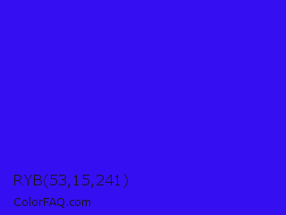 RYB 53,15,241 Color is a normal indigo color and the nearest color is Electric Ultramarine #3f00ff. Hex code #350ff1 and RGB value is rgb(53,15,241). In RGB color space, this color is composed of 21% red, 6% green, 95% blue, In CMYK color space, this color is composed of 78% cyan, 94% magenta, 0% yellow , 5% black , In HSL color space, this color has a hue angle of 250° , 89% saturation and 50% lightness.