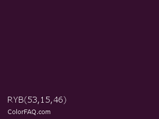 RYB 53,15,46 Color is a very dark magenta color and the nearest color is Revolver #2c1632. Hex code #350f2e and RGB value is rgb(53,15,46). In RGB color space, this color is composed of 21% red, 6% green, 18% blue, In CMYK color space, this color is composed of 0% cyan, 72% magenta, 13% yellow , 79% black , In HSL color space, this color has a hue angle of 311° , 56% saturation and 13% lightness.