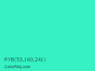 RYB 53,160,241 Color is a normal cyan color and the nearest color is Turquoise #40e0d0. Hex code #35f1c3 and RGB value is rgb(53,241,195). In RGB color space, this color is composed of 21% red, 95% green, 76% blue, In CMYK color space, this color is composed of 78% cyan, 0% magenta, 19% yellow , 5% black , In HSL color space, this color has a hue angle of 165° , 87% saturation and 58% lightness.