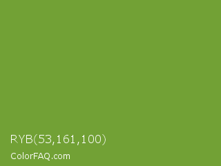 RYB 53,161,100 Color is a normal green color and the nearest color is Palm Leaf #6f9940. Hex code #72a135 and RGB value is rgb(114,161,53). In RGB color space, this color is composed of 45% red, 63% green, 21% blue, In CMYK color space, this color is composed of 29% cyan, 0% magenta, 67% yellow , 37% black , In HSL color space, this color has a hue angle of 86° , 50% saturation and 42% lightness.