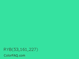 RYB 53,161,227 Color is a normal green color and the nearest color is Eucalyptus #44d7a8. Hex code #35e39f and RGB value is rgb(53,227,159). In RGB color space, this color is composed of 21% red, 89% green, 62% blue, In CMYK color space, this color is composed of 77% cyan, 0% magenta, 30% yellow , 11% black , In HSL color space, this color has a hue angle of 157° , 76% saturation and 55% lightness.