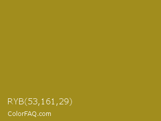 RYB 53,161,29 Color is a normal yellow color and the nearest color is Reef Gold #9f821c. Hex code #a18d1d and RGB value is rgb(161,141,29). In RGB color space, this color is composed of 63% red, 55% green, 11% blue, In CMYK color space, this color is composed of 0% cyan, 12% magenta, 82% yellow , 37% black , In HSL color space, this color has a hue angle of 51° , 69% saturation and 37% lightness.