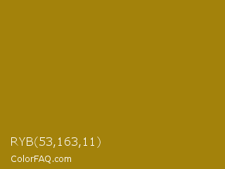 RYB 53,163,11 Color is a normal yellow color and the nearest color is Dark Yellow #9b870c. Hex code #a3820b and RGB value is rgb(163,130,11). In RGB color space, this color is composed of 64% red, 51% green, 4% blue, In CMYK color space, this color is composed of 0% cyan, 20% magenta, 93% yellow , 36% black , In HSL color space, this color has a hue angle of 47° , 87% saturation and 34% lightness.