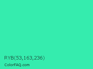 RYB 53,163,236 Color is a normal green color and the nearest color is Eucalyptus #44d7a8. Hex code #35ecae and RGB value is rgb(53,236,174). In RGB color space, this color is composed of 21% red, 93% green, 68% blue, In CMYK color space, this color is composed of 78% cyan, 0% magenta, 26% yellow , 7% black , In HSL color space, this color has a hue angle of 160° , 83% saturation and 57% lightness.