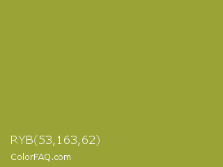 RYB 53,163,62 Color is a normal yellow color and the nearest color is Sushi #87ab39. Hex code #9aa335 and RGB value is rgb(154,163,53). In RGB color space, this color is composed of 60% red, 64% green, 21% blue, In CMYK color space, this color is composed of 6% cyan, 0% magenta, 67% yellow , 36% black , In HSL color space, this color has a hue angle of 65° , 51% saturation and 42% lightness.