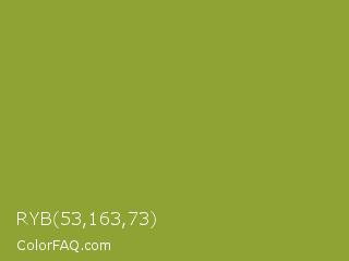 RYB 53,163,73 Color is a normal lime color and the nearest color is Sushi #87ab39. Hex code #8fa335 and RGB value is rgb(143,163,53). In RGB color space, this color is composed of 56% red, 64% green, 21% blue, In CMYK color space, this color is composed of 12% cyan, 0% magenta, 67% yellow , 36% black , In HSL color space, this color has a hue angle of 71° , 51% saturation and 42% lightness.