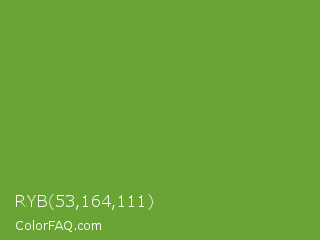 RYB 53,164,111 Color is a normal green color and the nearest color is Green RYB #66b032. Hex code #6aa435 and RGB value is rgb(106,164,53). In RGB color space, this color is composed of 42% red, 64% green, 21% blue, In CMYK color space, this color is composed of 35% cyan, 0% magenta, 68% yellow , 36% black , In HSL color space, this color has a hue angle of 91° , 51% saturation and 43% lightness.