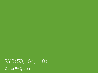 RYB 53,164,118 Color is a normal green color and the nearest color is Green RYB #66b032. Hex code #63a435 and RGB value is rgb(99,164,53). In RGB color space, this color is composed of 39% red, 64% green, 21% blue, In CMYK color space, this color is composed of 40% cyan, 0% magenta, 68% yellow , 36% black , In HSL color space, this color has a hue angle of 95° , 51% saturation and 43% lightness.