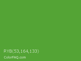 RYB 53,164,133 Color is a normal green color and the nearest color is Apple #4fa83d. Hex code #54a435 and RGB value is rgb(84,164,53). In RGB color space, this color is composed of 33% red, 64% green, 21% blue, In CMYK color space, this color is composed of 49% cyan, 0% magenta, 68% yellow , 36% black , In HSL color space, this color has a hue angle of 103° , 51% saturation and 43% lightness.