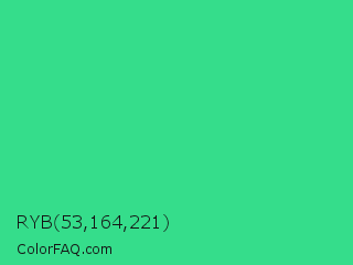 RYB 53,164,221 Color is a normal green color and the nearest color is Shamrock #33cc99. Hex code #35dd8b and RGB value is rgb(53,221,139). In RGB color space, this color is composed of 21% red, 87% green, 55% blue, In CMYK color space, this color is composed of 76% cyan, 0% magenta, 37% yellow , 13% black , In HSL color space, this color has a hue angle of 151° , 71% saturation and 54% lightness.