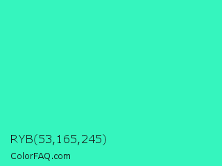 RYB 53,165,245 Color is a normal green color and the nearest color is Turquoise #40e0d0. Hex code #35f5be and RGB value is rgb(53,245,190). In RGB color space, this color is composed of 21% red, 96% green, 75% blue, In CMYK color space, this color is composed of 78% cyan, 0% magenta, 22% yellow , 4% black , In HSL color space, this color has a hue angle of 163° , 91% saturation and 58% lightness.