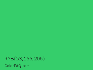 RYB 53,166,206 Color is a normal green color and the nearest color is UFO Green #3cd070. Hex code #35ce6b and RGB value is rgb(53,206,107). In RGB color space, this color is composed of 21% red, 81% green, 42% blue, In CMYK color space, this color is composed of 74% cyan, 0% magenta, 48% yellow , 19% black , In HSL color space, this color has a hue angle of 141° , 61% saturation and 51% lightness.