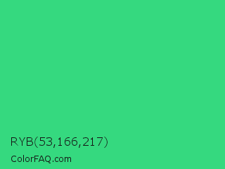 RYB 53,166,217 Color is a normal green color and the nearest color is UFO Green #3cd070. Hex code #35d97f and RGB value is rgb(53,217,127). In RGB color space, this color is composed of 21% red, 85% green, 50% blue, In CMYK color space, this color is composed of 76% cyan, 0% magenta, 41% yellow , 15% black , In HSL color space, this color has a hue angle of 147° , 68% saturation and 53% lightness.