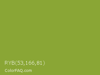 RYB 53,166,81 Color is a normal lime color and the nearest color is Sushi #87ab39. Hex code #8aa635 and RGB value is rgb(138,166,53). In RGB color space, this color is composed of 54% red, 65% green, 21% blue, In CMYK color space, this color is composed of 17% cyan, 0% magenta, 68% yellow , 35% black , In HSL color space, this color has a hue angle of 75° , 52% saturation and 43% lightness.