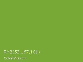 RYB 53,167,101 Color is a normal green color and the nearest color is Sushi #87ab39. Hex code #77a735 and RGB value is rgb(119,167,53). In RGB color space, this color is composed of 47% red, 65% green, 21% blue, In CMYK color space, this color is composed of 29% cyan, 0% magenta, 68% yellow , 35% black , In HSL color space, this color has a hue angle of 85° , 52% saturation and 43% lightness.