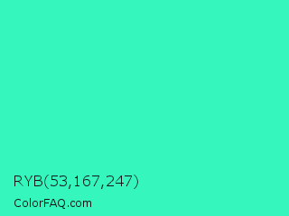 RYB 53,167,247 Color is a normal green color and the nearest color is Turquoise #40e0d0. Hex code #35f7bd and RGB value is rgb(53,247,189). In RGB color space, this color is composed of 21% red, 97% green, 74% blue, In CMYK color space, this color is composed of 79% cyan, 0% magenta, 23% yellow , 3% black , In HSL color space, this color has a hue angle of 162° , 92% saturation and 59% lightness.