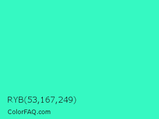 RYB 53,167,249 Color is a normal green color and the nearest color is Turquoise #40e0d0. Hex code #35f9c2 and RGB value is rgb(53,249,194). In RGB color space, this color is composed of 21% red, 98% green, 76% blue, In CMYK color space, this color is composed of 79% cyan, 0% magenta, 22% yellow , 2% black , In HSL color space, this color has a hue angle of 163° , 94% saturation and 59% lightness.