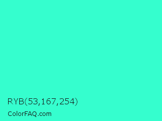 RYB 53,167,254 Color is a normal cyan color and the nearest color is Turquoise #40e0d0. Hex code #35fece and RGB value is rgb(53,254,206). In RGB color space, this color is composed of 21% red, 100% green, 81% blue, In CMYK color space, this color is composed of 79% cyan, 0% magenta, 19% yellow , 0% black , In HSL color space, this color has a hue angle of 166° , 99% saturation and 60% lightness.
