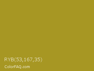 RYB 53,167,35 Color is a normal yellow color and the nearest color is Lemon Ginger #ac9e22. Hex code #a79723 and RGB value is rgb(167,151,35). In RGB color space, this color is composed of 65% red, 59% green, 14% blue, In CMYK color space, this color is composed of 0% cyan, 10% magenta, 79% yellow , 35% black , In HSL color space, this color has a hue angle of 53° , 65% saturation and 40% lightness.