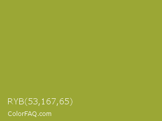 RYB 53,167,65 Color is a normal yellow color and the nearest color is Sushi #87ab39. Hex code #9ba735 and RGB value is rgb(155,167,53). In RGB color space, this color is composed of 61% red, 65% green, 21% blue, In CMYK color space, this color is composed of 7% cyan, 0% magenta, 68% yellow , 35% black , In HSL color space, this color has a hue angle of 66° , 52% saturation and 43% lightness.