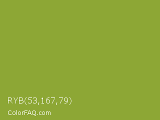 RYB 53,167,79 Color is a normal lime color and the nearest color is Sushi #87ab39. Hex code #8da735 and RGB value is rgb(141,167,53). In RGB color space, this color is composed of 55% red, 65% green, 21% blue, In CMYK color space, this color is composed of 16% cyan, 0% magenta, 68% yellow , 35% black , In HSL color space, this color has a hue angle of 74° , 52% saturation and 43% lightness.
