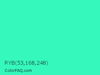 RYB 53,168,248 Color is a normal green color and the nearest color is Turquoise #40e0d0. Hex code #35f8bd and RGB value is rgb(53,248,189). In RGB color space, this color is composed of 21% red, 97% green, 74% blue, In CMYK color space, this color is composed of 79% cyan, 0% magenta, 24% yellow , 3% black , In HSL color space, this color has a hue angle of 162° , 93% saturation and 59% lightness.