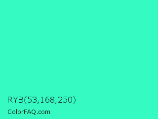 RYB 53,168,250 Color is a normal green color and the nearest color is Turquoise #40e0d0. Hex code #35fac1 and RGB value is rgb(53,250,193). In RGB color space, this color is composed of 21% red, 98% green, 76% blue, In CMYK color space, this color is composed of 79% cyan, 0% magenta, 23% yellow , 2% black , In HSL color space, this color has a hue angle of 163° , 95% saturation and 59% lightness.