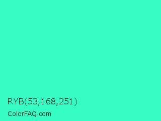 RYB 53,168,251 Color is a normal green color and the nearest color is Turquoise #40e0d0. Hex code #35fbc4 and RGB value is rgb(53,251,196). In RGB color space, this color is composed of 21% red, 98% green, 77% blue, In CMYK color space, this color is composed of 79% cyan, 0% magenta, 22% yellow , 2% black , In HSL color space, this color has a hue angle of 163° , 96% saturation and 60% lightness.