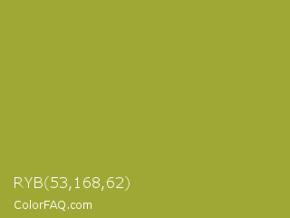 RYB 53,168,62 Color is a normal yellow color and the nearest color is Citron #9fa91f. Hex code #9fa835 and RGB value is rgb(159,168,53). In RGB color space, this color is composed of 62% red, 66% green, 21% blue, In CMYK color space, this color is composed of 5% cyan, 0% magenta, 68% yellow , 34% black , In HSL color space, this color has a hue angle of 65° , 52% saturation and 43% lightness.