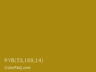 RYB 53,169,14 Color is a normal yellow color and the nearest color is Dark Yellow #9b870c. Hex code #a98a0e and RGB value is rgb(169,138,14). In RGB color space, this color is composed of 66% red, 54% green, 5% blue, In CMYK color space, this color is composed of 0% cyan, 18% magenta, 92% yellow , 34% black , In HSL color space, this color has a hue angle of 48° , 85% saturation and 36% lightness.