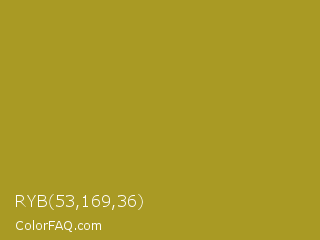 RYB 53,169,36 Color is a normal yellow color and the nearest color is Lemon Ginger #ac9e22. Hex code #a99a24 and RGB value is rgb(169,154,36). In RGB color space, this color is composed of 66% red, 60% green, 14% blue, In CMYK color space, this color is composed of 0% cyan, 9% magenta, 79% yellow , 34% black , In HSL color space, this color has a hue angle of 53° , 65% saturation and 40% lightness.